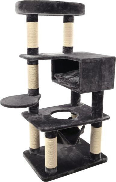 Ez az egyedi plüss kaparófa ideális pihenésre és játékra macskádnak. A macska relaxálhat az platformok egyikén, a aranyos rejtekhelyen a kivehető párnával vagy a kényelmes függőágyban. A kaparófa nemcsak tökéletes menedék macskád számára, hanem gyönyörű kiegészítő bármilyen lakásban. A kaparófa pamut kötélborítású kaparóoszlopokat, 3 plüssel borított pihenőplatformot, 1 párnás rejtekhelyet, 1 függőágyat, 1 plüss pihenőkosarat és 2 csengős plüss labdát tartalmaz.