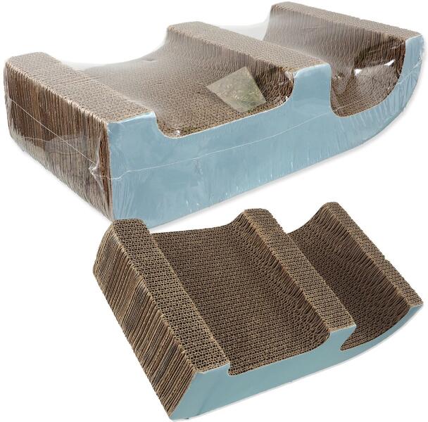 Újrahasznosított hullámkartonból készült kaparó macskagyökérrel.