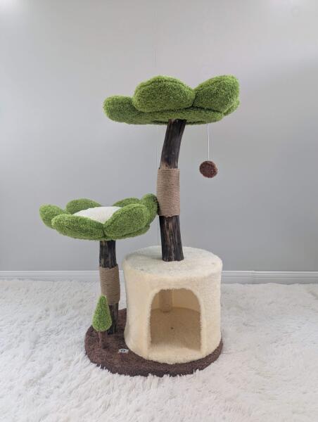 Ez a különleges macskafa nem csupán egy bútordarab, hanem egy varázslatos menedékhely, ahol kedvenced a természet ölelésében pihenhet, játszhat és álmodozhat. A puha zöld „fák lombjai között kényelmes kilátóhelyek rejtőznek, ahonnan cicád figyelheti a világot – vagy egyszerűen csak megfürdőzhet a nyugalomban. A sötétbarna  tömör fa törzsek, melyeket természetes kötél borít, ideálisak a karmoláshoz, míg az alsó bolyhos kuckó csendes visszavonulást kínál – mint egy fa gyökerei között megbújó kis erdei odú. ✨ Miért fogja imádni a cicád?
